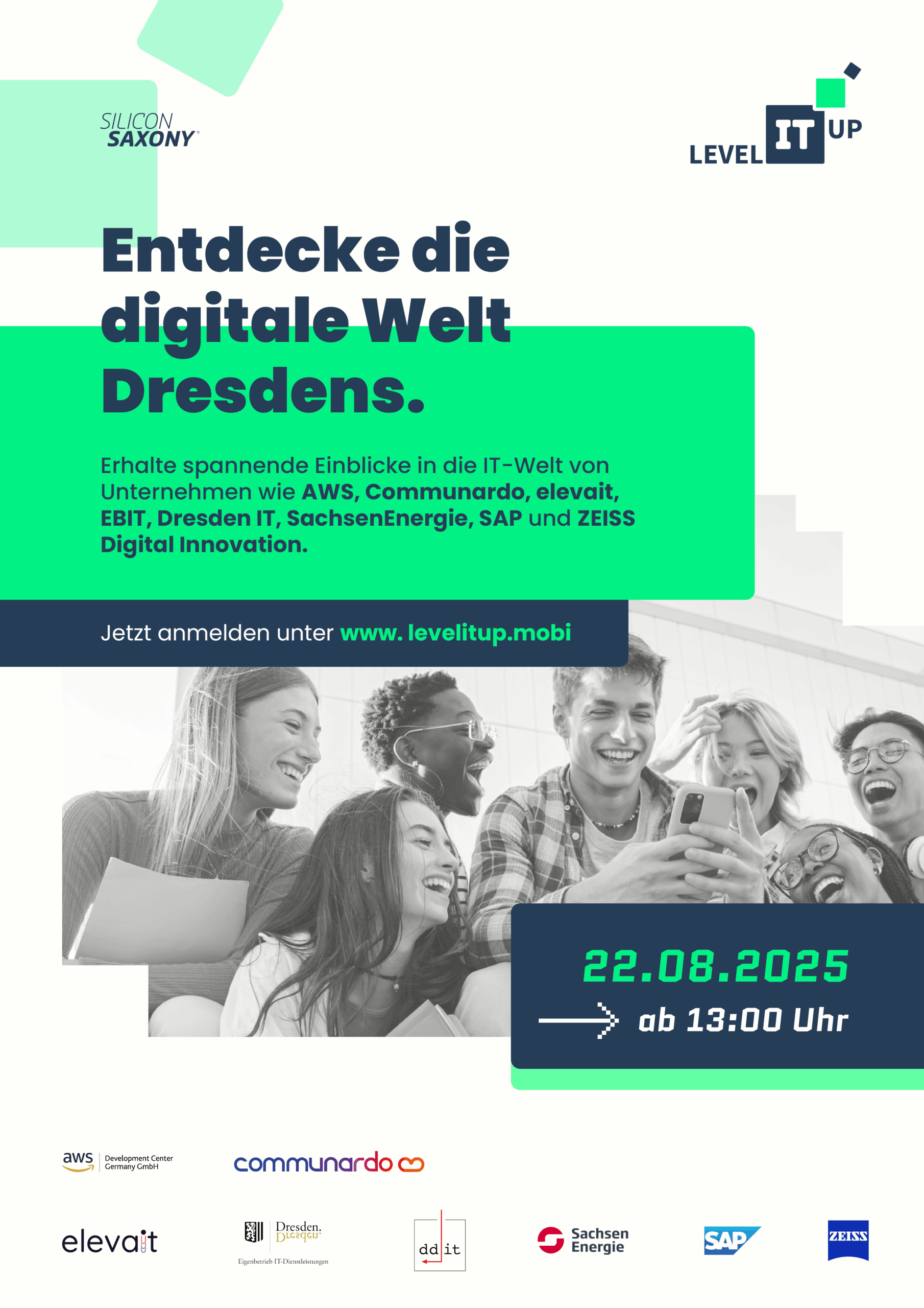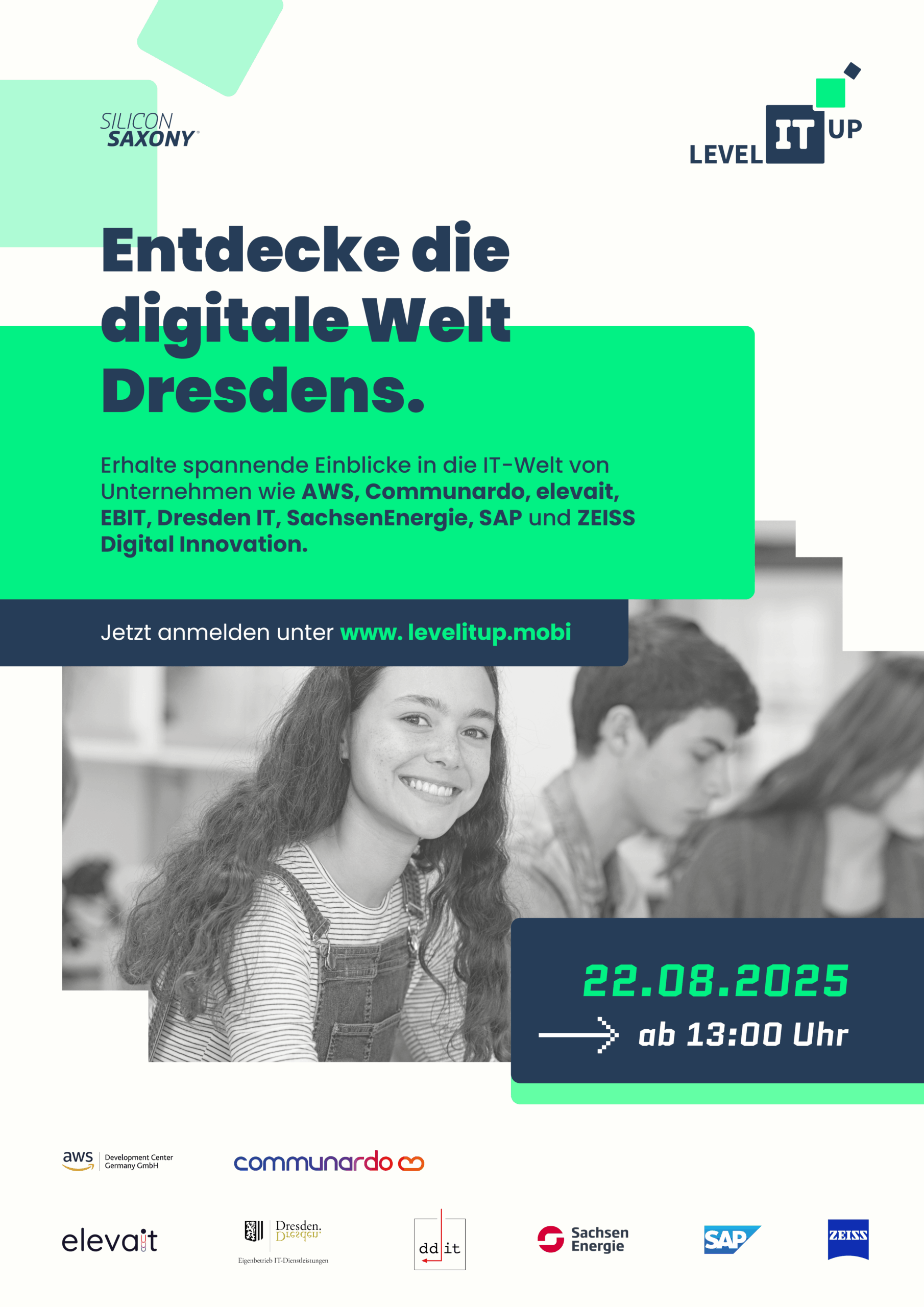 Level IT up ist ein praxisnahes Bildungsevent in Dresden, das Schülerinnen und Schülern von Klasse 7 bis 13 den Zugang zur digitalen Welt eröffnet und die Bandbreite der Digital & IT Unternehmen in Dresden zeigt. Durch Workshops, Live-Demos und Diskussionsrunden erleben die Schülerinnen und Schüler hautnah, wie IT funktioniert und welche Chancen sie bietet – sowohl beruflich als auch gesellschaftlich.